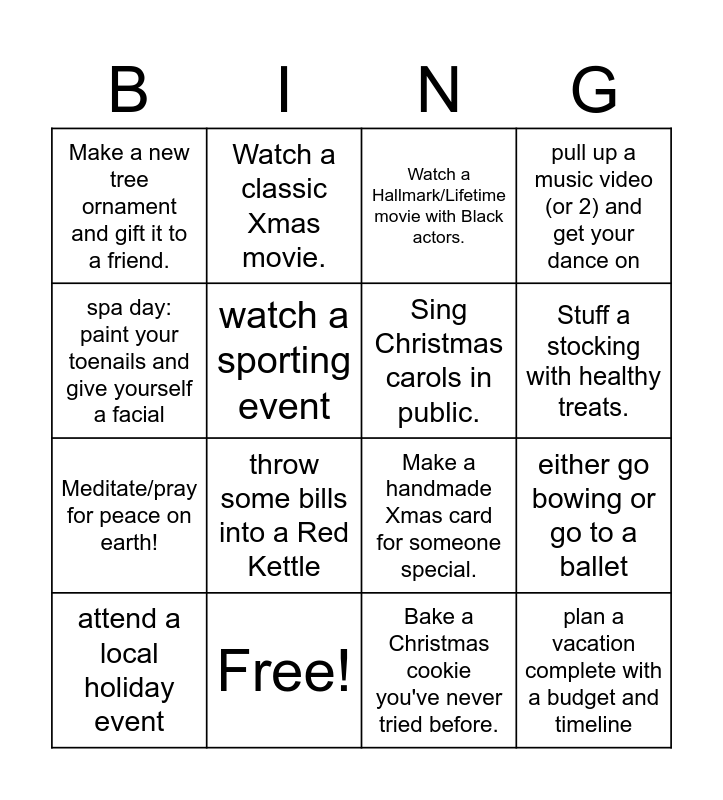 This bingo card has 21 words: Free!, Mix a holiday-flavored cocktail or mocktail., Watch a classic Xmas movie., Go ice skating, sledding, skiing or another outdoor activity, Bake a Christmas cookie you've never tried before., Sing Christmas carols in public., Make a new tree ornament and gift it to a friend., Watch a Hallmark/Lifetime movie with Black actors., Make a handmade Xmas card for someone special., Stuff a stocking with healthy treats., Meditate/pray for peace on earth!, pull up a music video (or 2) and get your dance on, plan a vacation complete with a budget and timeline, go screenless for 24 hrs, watch a sporting event, play a virtual game, attend a local holiday event, throw some bills into a Red Kettle, spa day: paint your toenails and give yourself a facial, either go bowing or go to a ballet and recognize and journal about your achievements in 2024.