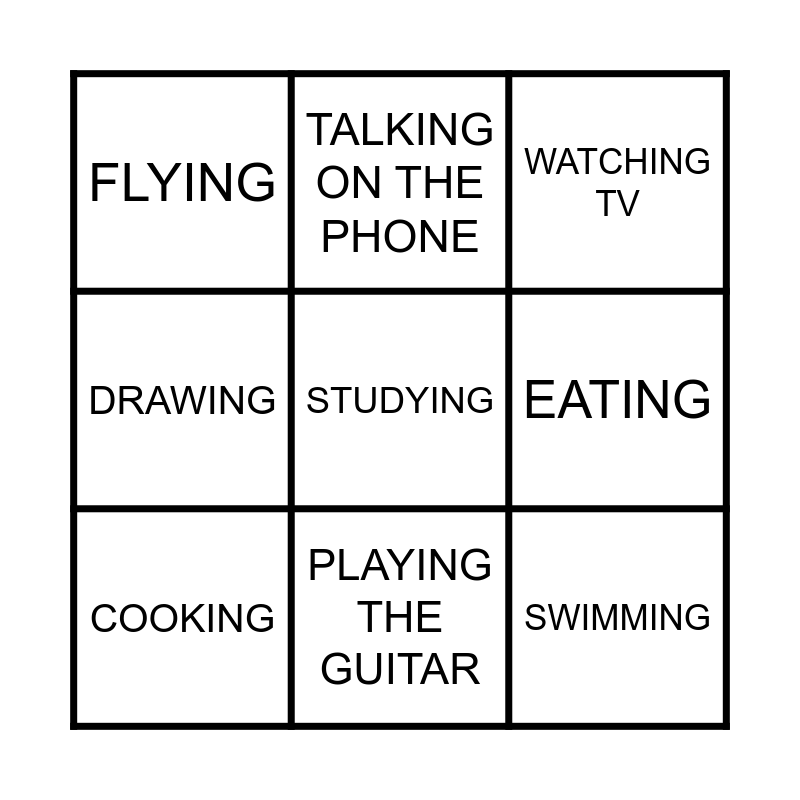 This bingo card has 27 words: JUMPING, WALKING, SWIMMING, SKATING, EATING, WATCHING TV, TALKING ON THE PHONE, PAINTING, CLIMBING, LISTENING TO MUSIC, DRINKING, DRAWING, SLEEPING, READING, DANCING, PLAYING FOOTBALL, COOKING, PLAYING THE GUITAR, SINGING, FLYING, RIDING A HORSE, RUNNING, RUNNING, WASHING UP, DOING EXCERCISE, STUDYING and RIDING A BIKE.