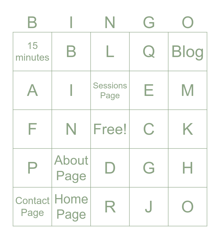 This bingo card has a free space and 24 words: About Page, Home Page, Sessions Page, Contact Page, Blog, 15 minutes, A, B, C, D, E, F, G, H, I, J, K, L, M, N, O, P, Q and R.