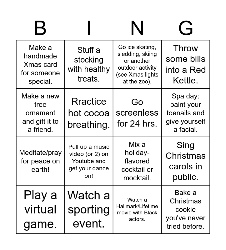 This bingo card has 19 words: Mix a holiday-flavored cocktail or mocktail., Watch a classic Xmas movie., Go ice skating, sledding, skiing or another outdoor activity (see Xmas lights at the zoo)., Bake a Christmas cookie you've never tried before., Sing Christmas carols in public., Make a new tree ornament and gift it to a friend., Watch a Hallmark/Lifetime movie with Black actors., Make a handmade Xmas card for someone special., Stuff a stocking with healthy treats., Meditate/pray for peace on earth!, Pull up a music video (or 2) on Youtube and get your dance on!, Rractice hot cocoa breathing., Go screenless for 24 hrs., Watch a sporting event., Play a virtual game., Attend a local holiday event., Throw some bills into a Red Kettle., Spa day: paint your toenails and give yourself a facial. and Create tree ornaments that celebrate your 2024 achievements..