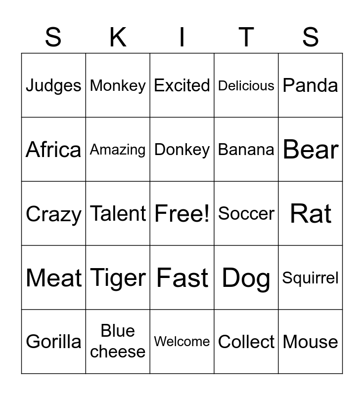 This bingo card has a free space and 31 words: Welcome, Animal, Talent, Show, Judges, Excited, Amazing, Dog, Soccer, Collect, Rat, Mouse, Paint, Strong, Bear, Dance, Squirrel, Tiger, Meat, Fast, Panda, Home, Gorilla, Monkey, Banana, Africa, Delicious, Crazy, Blue cheese, Donkey and Kick.