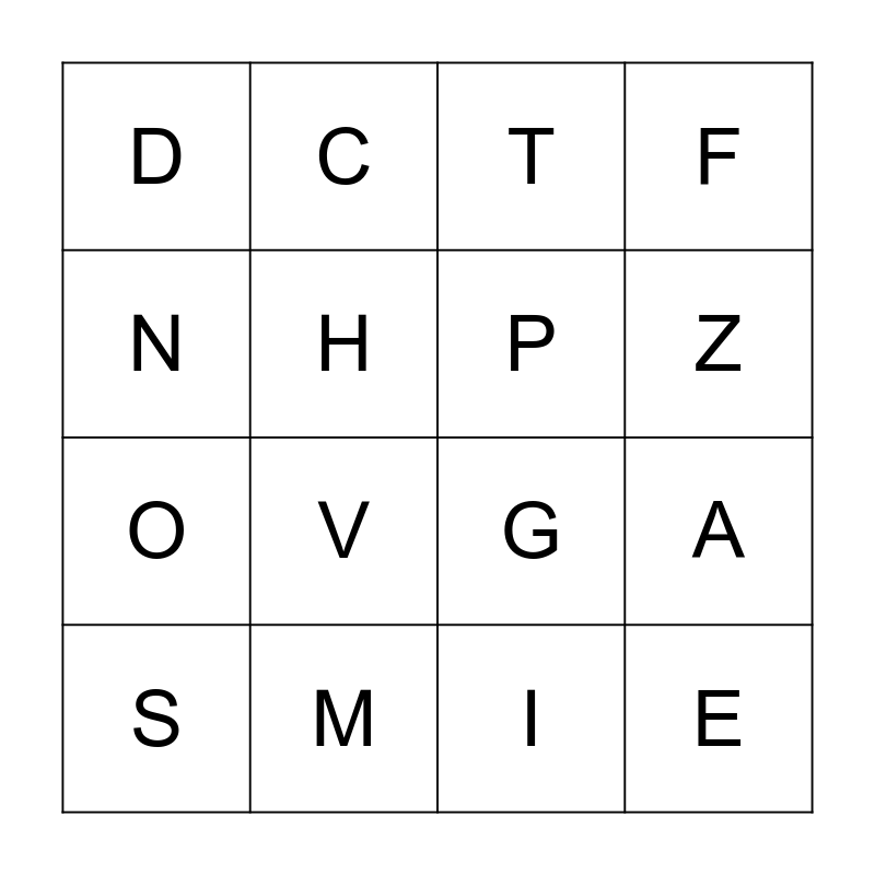 This bingo card has 16 words: M, A, T, D, O, C, G, I, N, H, S, F, V, Z, P and E.