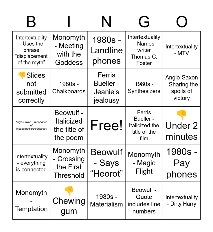 This bingo card has a free space and 96 words: 👎Canva link not shared correctly, Monomyth - Road of Trials, 👎Fuzzy pictures, Ferris Bueller - Italicized the title of the film, Ferris Bueller - The evolution of Cameron’s character, 👎Image with a watermark, Ferris Bueller - Mentions Jeanie, 👎Reading off slide, Monomyth - Crossing the Return Threshold, Beowulf - Uses a Kenning during presentation (write the kenning in the space), Ferris Bueller - Names Charlie Sheen, Monomyth - Supernatural Aid, Intertextuality - James Bond, Anglo-Saxon - Sharing the spoils of victory, Monomyth - Freedom to Live, 👎Slides not submitted correctly, Ferris Bueller - Jeanie’s jealousy, Ferris Bueller - Computer hacking, Beowulf - Mentions Unferth, 1980s - Answering Machines, Anglo-Saxon - Minimized role of women, Intertextuality - “Danke Schoen”, 👎Awkward font, Beowulf - Correctly pronounces Unferth, Beowulf - Says “Heorot”, 1980s - Materialism, Anglo-Saxon - Lineage, Intertextuality - Uses the phrase “displacement of the myth”, Anglo-Saxon - Heroic Feats, Intertextuality - “Twist and Shout”, 1980s - MTV (cable television), Monomyth - Magic Flight, Intertextuality - Wayne Newton, Requirements - Has a nice visual that is NOT a basic google slide template., Intertextuality - MTV, 1980s - Sibling Rivalry, 1980s - Pay phones, Ferris Bueller - Cameron as the hero, Intertextuality - “Go Down Moses”, Beowulf - Italicized the title of the poem, 1980s - Prank phone Calls, Monomyth - Temptation, Intertextuality - Dirty Harry, 👎Chewing gum, Intertextuality - everything is connected, 1980s - Landline phones, Intertextuality - Shared structure of stories, Ferris Bueller - Mentions Sloane, Monomyth - Mastery of Two Worlds, Intertextuality - The Beatles, Intertextuality - Gordie Howe, Ferris Bueller - singing on a float, Requirements - Answers “why do we tell stories?”, 1980s - Fashion, Intertextuality - Identifies specific archetypes from texts, Intertextuality - Alien, Beowulf - Uses a quote from the text, 1980s - TV everywhere, 👎Stretched photos (out of proportion), Ferris Bueller - Discusses 80s rebellion/quest for independence, 👎Slide with just text, Anglo-Saxon - Tribal culture, Intertextuality - Star Wars, Ferris Bueller - Discusses Ferris’ parents, 👎Looping animated GIFs, Monomyth - Refusal of the Return, Intertextuality - Charlie Sheen drug use, 1980s - Typewriters, Intertextuality - Uses the word “archetype”, Beowulf - Quote includes line numbers, 1980s - Computer, Beowulf - Correctly pronounces Whealtheow, Ferris Bueller - Ferris as a Supernatural Aid, Mentions one of the crazy things Ferris gets away with., 1980s - Teen independence, 👎Hard to read color scheme, Intertextuality - Chicago Cubs, 1980s - Chalkboards, Ferris Bueller - Jealous of Jeanie’s car, 1980s - Synthesizers, Intertextuality - Names writer Thomas C. Foster, Monomyth - Call to Adventure, Monomyth - The Ultimate Boon, Monomyth - Atonement of the Father, 👎Asks teacher how to change slides, Anglo-Saxon - Importance of lineage/pedigree/ancestry, Monomyth - Crossing the First Threshold, Ferris Bueller - Discusses Principal Rooney, Requirements - Isn’t reading off of slides like a robot., 👎Under 2 minutes, Monomyth - Refusal of the Call, Anglo-Saxon - Bravery/Courage, Intertextuality - Pac-Man, Anglo-Saxon - Warrior Culture, Monomyth - Meeting with the Goddess and 1980s - arcades.