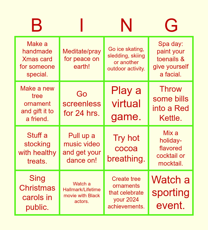 This bingo card has 20 words: Mix a holiday-flavored cocktail or mocktail., Watch a classic Xmas movie., Go ice skating, sledding, skiing or another outdoor activity., Bake a Christmas cookie you've never tried before., Sing Christmas carols in public., Make a new tree ornament and gift it to a friend., Watch a Hallmark/Lifetime movie with Black actors., Make a handmade Xmas card for someone special., Stuff a stocking with healthy treats., Meditate/pray for peace on earth!, Pull up a music video and get your dance on!, Try hot cocoa breathing., Go screenless for 24 hrs., Watch a sporting event., Play a virtual game., Attend a local holiday event., Throw some bills into a Red Kettle., Spa day: paint your toenails & give yourself a facial., Create tree ornaments that celebrate your 2024 achievements. and Practice holiday breaths..