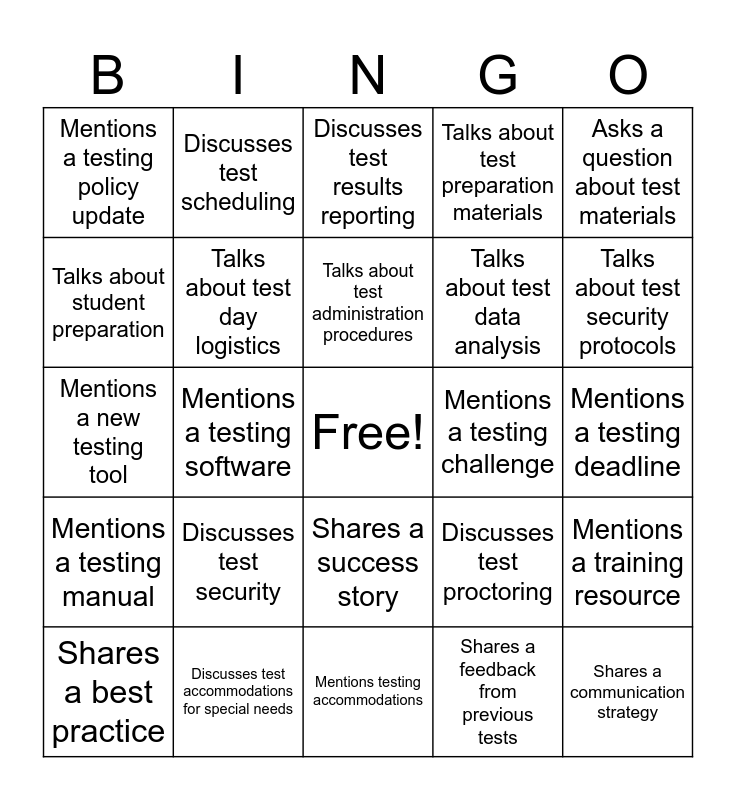 This bingo card has a free space and 25 words: Discusses test security, Mentions testing accommodations, Talks about test administration procedures, Shares a best practice, Asks a question about test materials, Mentions a testing policy update, Talks about student preparation, Discusses test scheduling, Mentions a testing challenge, Shares a success story, Talks about test data analysis, Mentions a new testing tool, Discusses test proctoring, Mentions a training resource, Talks about test day logistics, Shares a tip for reducing test anxiety, Mentions a testing deadline, Discusses test results reporting, Talks about test security protocols, Mentions a testing software, Shares a communication strategy, Discusses test accommodations for special needs, Mentions a testing manual, Talks about test preparation materials and Shares a feedback from previous tests.