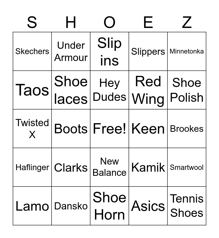 This bingo card has a free space and 24 words: Clarks, Dansko, Hey Dudes, Lamo, Minnetonka, Skechers, Taos, Under Armour, Keen, New Balance, Red Wing, Twisted X, Kamik, Smartwool, Shoe laces, Asics, Brookes, Slip ins, Shoe Polish, Boots, Tennis Shoes, Haflinger, Slippers and Shoe Horn.