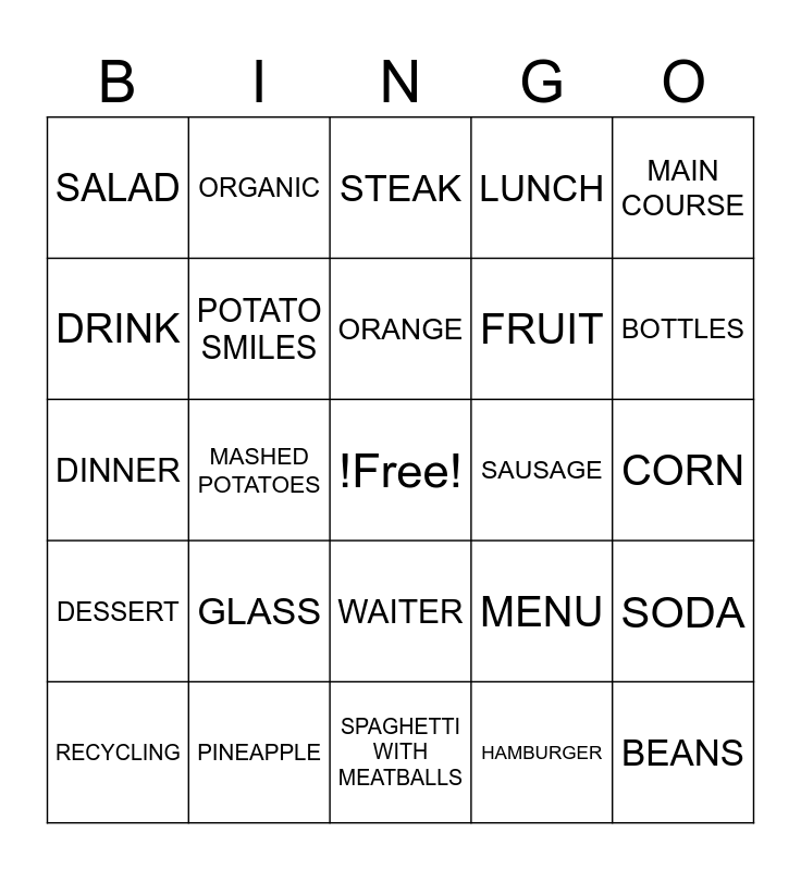 This bingo card has a free space and 31 words: SPAGHETTI WITH MEATBALLS, CHICKEN FINGERS, MASHED POTATOES, VEGETABLES, SALAD, STEAK, POTATO SMILES, MENU, SAUSAGE, HAMBURGER, CORN, BEANS, WATERMELON, BBQ, BOTTLES, PITCHER, SODA, GLASS, DESSERT, WAITER, MAIN COURSE, BATTERY, RECYCLING, ORGANIC, FRUIT, DRINK, LUNCH, DINNER, PINEAPPLE, ORANGE and GRAPE.