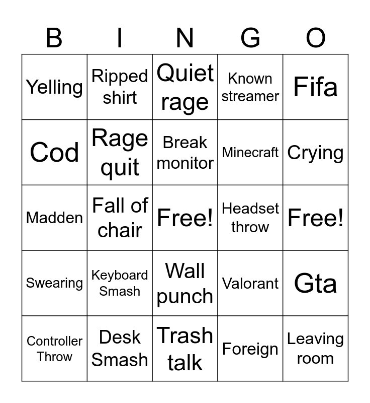 This bingo card has a free space and 24 words: Keyboard Smash, Desk Smash, Break monitor, Controller Throw, Fifa, Yelling, Cod, Ripped shirt, Headset throw, Wall punch, Minecraft, Madden, Valorant, Gta, Rage quit, Foreign, Free!, Quiet rage, Crying, Fall of chair, Leaving room, Swearing, Known streamer and Trash talk.