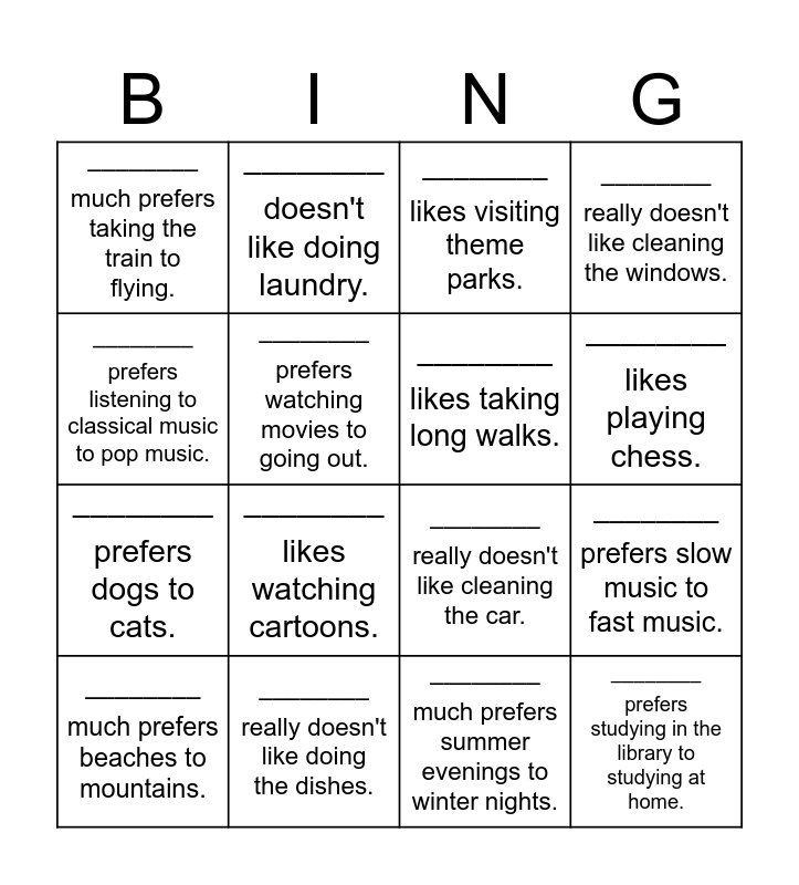 ⚠ This card has duplicate items: –––––––– prefers playing sports to watching them. (2), –––––––– doesn't like waking up late. (2), –––––––– doesn't like staying up late. (2)