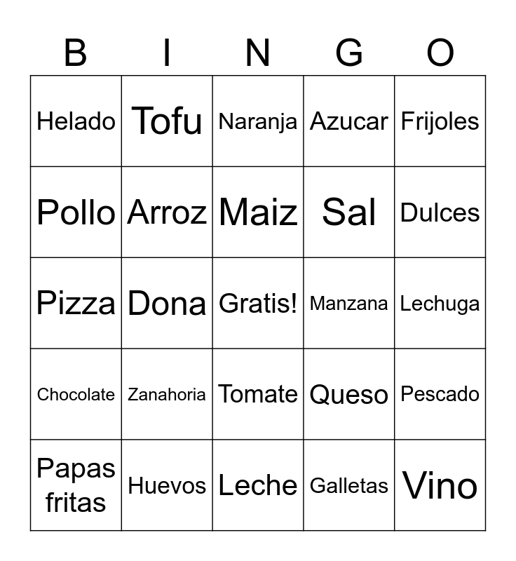 This bingo card has a free space and 29 words: Papas fritas, Fresa, Dona, Churros, Helado, Naranja, Arroz, Zanahoria, Manzana, Huevos, Lechuga, Vino, Leche, Galletas, Dulces, Refresco, Tomate, Chocolate, Frijoles, Pizza, Queso, Pan, Sal, Pollo, Azucar, Tofu, Pescado, Maiz and Bebidas energéticas.