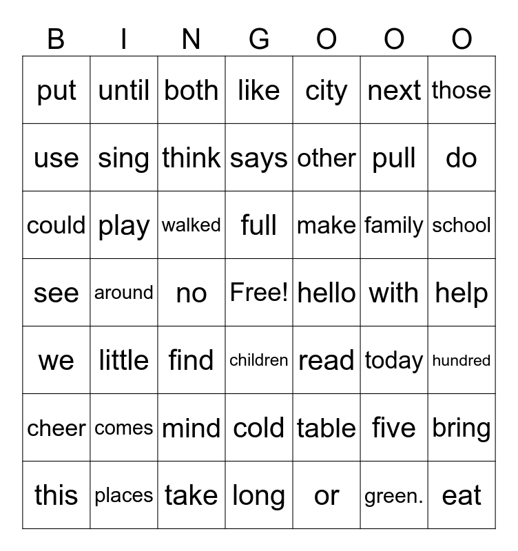 This bingo card has a free space and 49 words: five, pull, or, around, walked, help, until, take, next, children, those, like, family, make, comes, with, use, do, bring, city, other, no, put, sing, this, think, school, places, full, play, by, hello, cheer, mind, see, read, today, hundred, could, find, cold, we, eat, long, says, both, table, little and green..