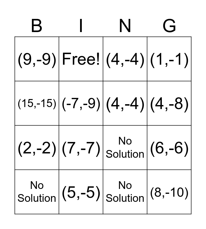 This bingo card has 16 words: (5,-5), (6,-6), (4,-4), (9,-9), (2,-2), Free!, No Solution, No Solution, (15,-15), (-7,-9), No Solution, (1,-1), (7,-7), (4,-8), (4,-4) and (8,-10).