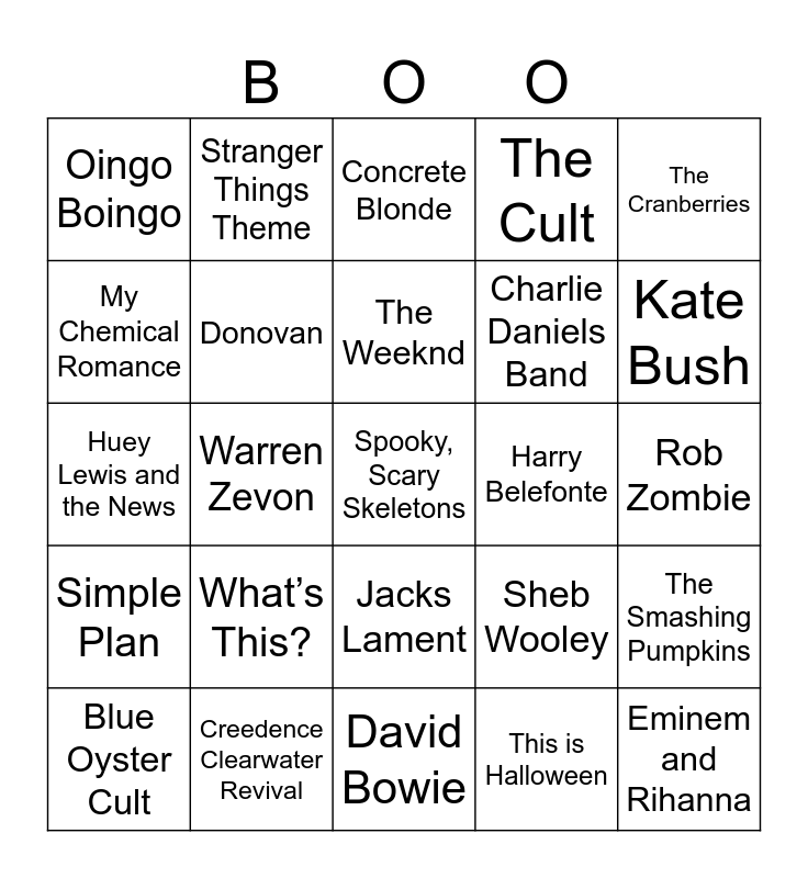This bingo card has 44 words: Alice Cooper, Spooky, Scary Skeletons, Black Sabbath, Blue Oyster Cult, Monster Mash, This is Halloween, Concrete Blonde, The Cramps, The Cranberries, Creedence Clearwater Revival, The Cult, Harry Belefonte, Jacks Lament, What’s This?, Kidnap the Sandy Claus, David Bowie, Duran Duran, Huey Lewis and the News, Michael Jackson, Kate Bush, Stranger Things Theme, The Misfits, Hex Girls, Oingo Boingo, Ozzy Osbourne, Rob Zombie, Rockwell, Screamin Jay Hawkins, Sheb Wooley, Simple Plan, Siouxie and the Banshees, The Smashing Pumpkins, Stevie Wonder, Talking Heads, Warren Zevon, Olivia Rodrigo, Doja Cat, Eminem and Rihanna, The Weeknd, My Chemical Romance, Charlie Daniels Band, Teddy Swims, Donovan and The Living Tombstone.