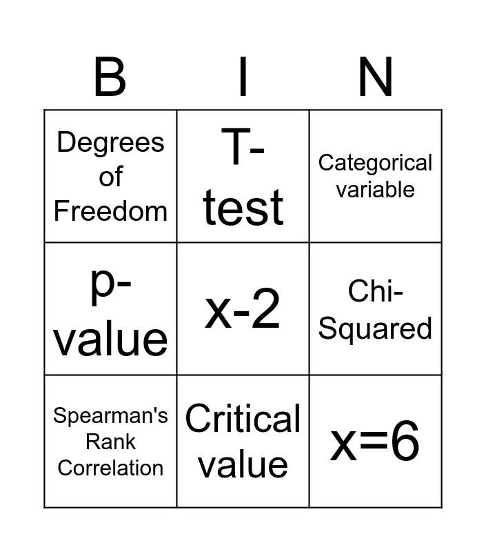 This bingo card has a free space and 8 words: Chi-Squared, Categorical variable, T-test, Spearman's Rank Correlation, Degrees of Freedom, x=6, p-value and Critical value.