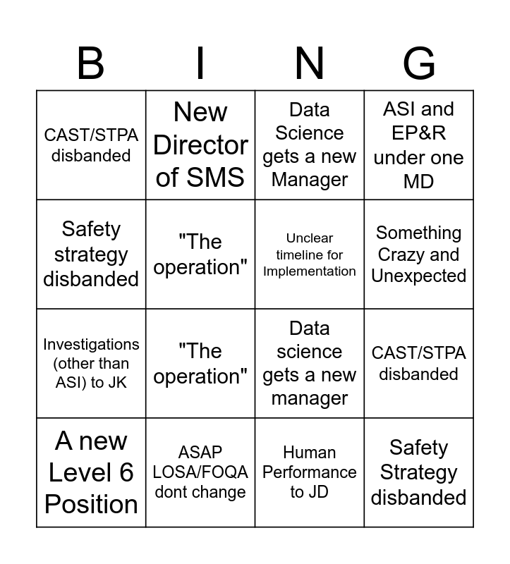 This bingo card has 24 words: Human performance to JD, Bobbi mentioned by Name, Something Crazy and Unexpected, A new level 6 position, Safety strategy disbanded, CAST/STPA disbanded, "The operation", New Director of SMS, ASAP LOSA/FOQA dont change, Bobbi mentioned indirectly, Investigations (other than ASI) to JK, Data science gets a new manager, Efficiency dispanded, Fatigue to JD, Unclear timeline for Implementation, EP&R to JD, Human Performance to JD, Data Science gets a new Manager, "The operation", CAST/STPA disbanded, A new Level 6 Position, Safety Strategy disbanded, ASI and EP&R under one MD and EP&R to JD.