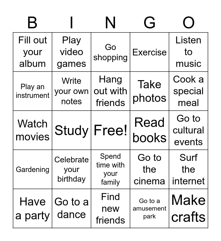 This bingo card has a free space and 24 words: Celebrate your birthday, Go to a dance, Hang out with friends, Have a party, Listen to music, Fill out your album, Play an instrument, Play video games, Read books, Spend time with your family, Take photos, Watch movies, Go to the cinema, Surf the internet, Write your own notes, Go to a amusement park, Go to cultural events, Go shopping, Cook a special meal, Study, Make crafts, Gardening, Exercise and Find new friends.