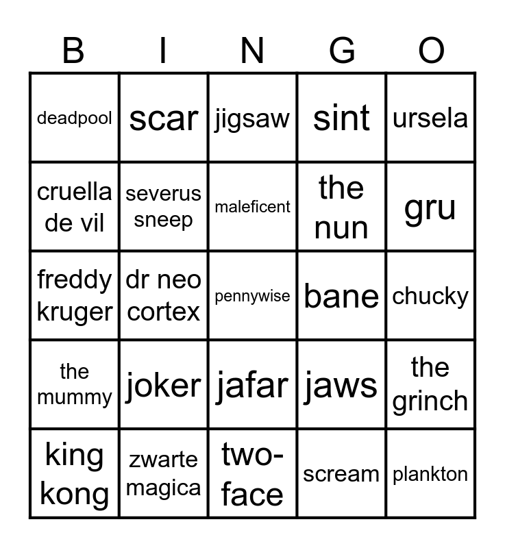This bingo card has 30 words: zwarte magica, boze heks, dr neo cortex, bowser, deadpool, jigsaw, severus sneep, jafar, bane, two-face, chucky, pennywise, scream, plankton, gru, annabelle, jaws, the mummy, joker, ursela, freddy kruger, voldemort, scar, the nun, cruella de vil, sint, the grinch, king kong, maleficent and harley quinn.
