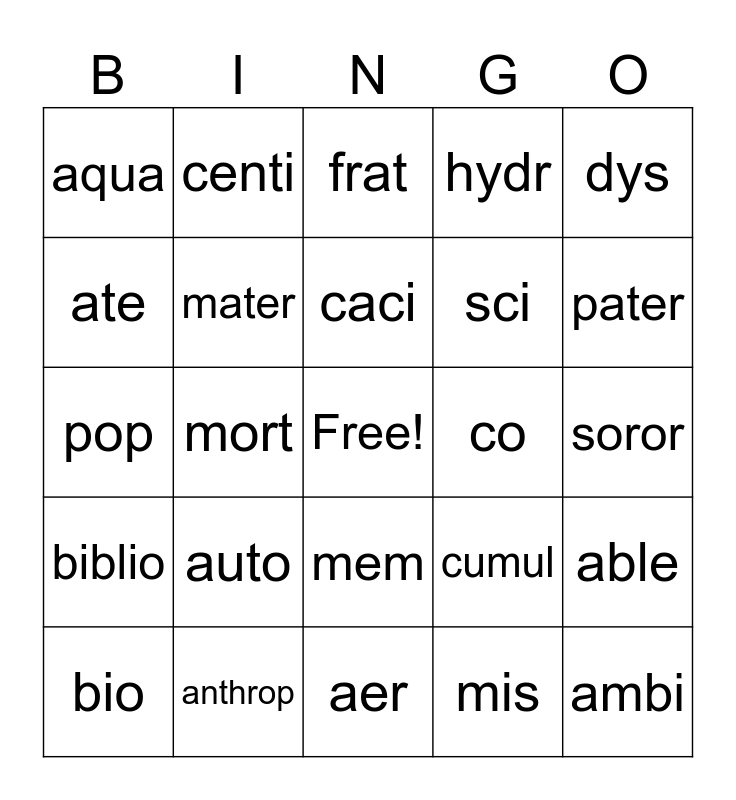 This bingo card has a free space and 24 words: auto, anthrop, caci, bio, dys, aqua, ate, centi, co, mem, sci, pop, cumul, able, mater, mis, soror, frat, pater, mort, ambi, biblio, hydr and aer.