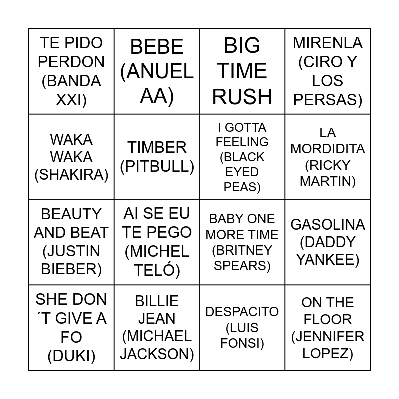 This bingo card has 41 words: Free!, BABY ONE MORE TIME (BRITNEY SPEARS), WANNABE (SPICE GIRLS), I GOTTA FEELING (BLACK EYED PEAS), DON (MIRANDA), UPTOWN FUNK (BRUNO MARS), LA MORDIDITA (RICKY MARTIN), PA´ LA SELECCION (LA T Y LA M), WAKA WAKA (SHAKIRA), ON THE FLOOR (JENNIFER LOPEZ), GASOLINA (DADDY YANKEE), MIRENLA (CIRO Y LOS PERSAS), SHE DON´T GIVE A FO (DUKI), DESPACITO (LUIS FONSI), BILLIE JEAN (MICHAEL JACKSON), BORRO CASSETTE (MALUMA), CRIMINAL (OZUNA), TE PIDO PERDON (BANDA XXI), BARBIE GIRL (AQUA), BIG TIME RUSH, LIFE IS A HIGHWAY (CARS), SHAKE IT OFF (TAYLOR SWIFT), ES LA QUE VA (NOTA LOKOS), BEAUTY AND BEAT (JUSTIN BIEBER), MEMORIES (DAVID GUETTA), WHAT MAKES YOU BEAUTIFUL (ONE DIRECTION), LA ORIGINAL (EMILIA), BABY (JUSTIN BIEBER), AI SE EU TE PEGO (MICHEL TELÓ), LLORA ME LLAMA (GRUPO PLAY), ME REHUSO (DANNY OCEAN), BEBE (ANUEL AA), MANICOMIO (COSCULLUELA), YO TE PROPONGO (ROMBAI), CHULO (BAD GYAL), TIMBER (PITBULL), MUEVE EL OMBLIGO, TOXIC (BRITNEY SPEARS), BAD ROMANCE (LADY GAGA), MAGIC (SELENA GOMEZ) and STARSHIPS (NICKY MINAJ).