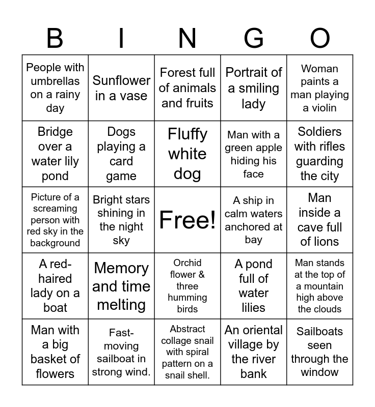 This bingo card has a free space and 68 words: Big waves hangs over wooden boats at sea, Sailboats seen through the window, Ship battle at sea, Sleeping woman in an orange dress, Woman sits on an armchair, White roses and green leaves in a vase, Sunflower in a vase, A box of green plums, Fluffy white dog, Shiny white roses on a blue cloth, Orchid flower & three humming birds, Fruits, flowers, tea cup and a book on a table, Man inside a cave full of lions, Woman paints a man playing a violin, Army general on a horse, Bridge over a water lily pond, Bright stars shining in the night sky, People with umbrellas on a rainy day, Girl wearing a pearl earring, Memory and time melting, Man with a green apple hiding his face, A pond full of water lilies, A red-haired lady on a boat, Lunch party by a lake with sailboats, Poor women collecting wheat from a field, Lady in a white and purple dress sits on a chair, Two woman and a man have dinner at a restaurant, Lady on a swing in a garden, Man stands at the top of a mountain high above the clouds, Four people in a diner on the corner of an empty street at night, Forest full of animals and fruits, Woman with a man holding a pitchfork, Busy park near a lake full of boats, Busy cafe terrace at night, Portrait of a smiling lady, Collage of sea monsters, People dancing and drinking on the street, Man with a big basket of flowers, Soldiers with rifles guarding the city, Picture of a screaming person with red sky in the background, Supper or meal on a long table with friends, An old woman wearing black sitting in the chair, Dogs playing a card game, Survivors floating on a wooden mast in rough seas, Couple embracing each other, People under a big archway of a building from classical times, Black and white abstract painting of screaming woman and horses, Silhouette of two small rowboats in a harbour at sunrise, A ship in calm waters anchored at bay, Fast-moving sailboat in strong wind., Train line to a factory with a smoking chimney, Evening in a farm with many animals and moon in the background., Abstract picture weeping (crying) woman holding her child, Abstract collage snail with spiral pattern on a snail shell., Beautiful ballerina dancing and a man in black suit behind curtains., A native person surrounded by wild exotic animals., An oriental village by the river bank, Spring morning in a palace with many princesses, Everyday life in a farm village in Indonesia, Abstract portrait of man with curly hair suffering, Person kneeling and holding out a wine cup, African farm with background of a mountain with twin peaks, Child feeding a woman, Workers digging a canal in the dessert, Abstract line drawing symbolizing history, colonialism, capitalism, geopolitics, war, movement in Africa, Workers and women carrying jars above their heads., Asian green lady wearing robes with gold print and King's daughter, her brothers and friends..