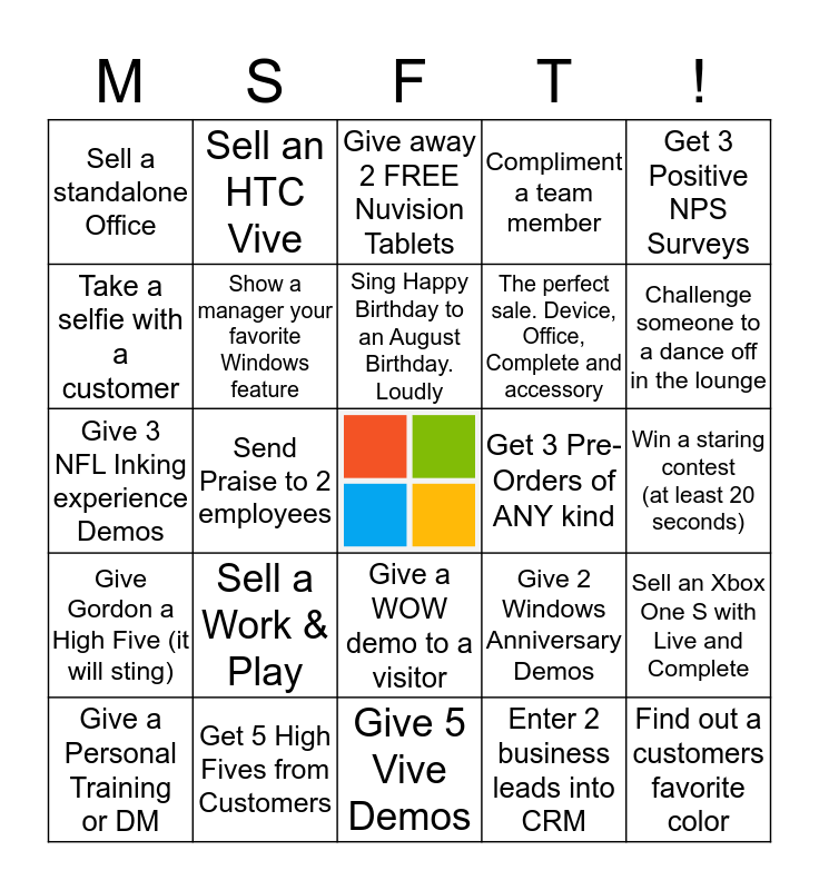 This bingo card has a free space and 24 words: Sell a Work & Play, Get 5 High Fives from Customers, Sing Happy Birthday to an August Birthday. Loudly, Give a Personal Training or DM, Get 3 Positive NPS Surveys, Sell a standalone Office, Take a selfie with a customer, Sell an HTC Vive, Get 3 Pre-Orders of ANY kind, Give a WOW demo to a visitor, The perfect sale. Device, Office, Complete and accessory, Give 3 NFL Inking experience Demos, Give 2 Windows Anniversary Demos, Sell an Xbox One S with Live and Complete, Show a manager your favorite Windows feature, Enter 2 business leads into CRM, Win a staring contest (at least 20 seconds), Give away 2 FREE Nuvision Tablets, Challenge someone to a dance off in the lounge, Send Praise to 2 employees, Find out a customers favorite color, Give Gordon a High Five (it will sting), Compliment a team member and Give 5 Vive Demos.