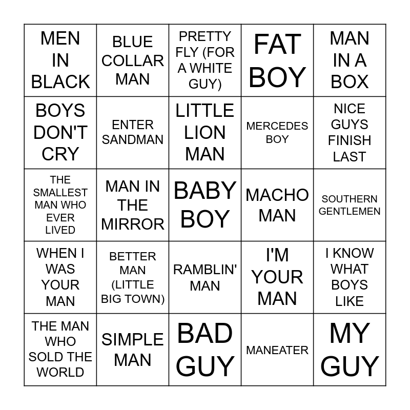 This bingo card has 50 words: ANY MAN OF MINE, BABY BOY, BAD BOYS, BAD GUY, BETTER MAN (LITTLE BIG TOWN), BETTER MAN (PEARL JAM), BLUE COLLAR MAN, BOOM I GOT YOUR BOYFRIEND, BOYS DON'T CRY, DIE A HAPPY MAN, ENTER SANDMAN, FAT BOY, I KNOW WHAT BOYS LIKE, I'M YOUR MAN, IT'S RAINING MEN, LET'S HEAR IT FOR THE BOY, LITTLE LION MAN, MACHO MAN, MAGIC MAN, MAN IN A BOX, MAN IN THE MIRROR, MANEATER, MEN IN BLACK, MERCEDES BOY, MR. SANDMAN, MY GUY, NICE GUYS FINISH LAST, PIANO MAN, PRETTY FLY (FOR A WHITE GUY), RAMBLIN' MAN, ROCKET MAN, RUDE BOY, SCATMAN (SKI-BA-BOP-BA-DOP-BOP), SHARP DRESSED MAN, SIMPLE MAN, SK8ER BOI, SMALL TOWN BOY, SOME GUYS HAVE ALL THE LUCK, SON OF A PREACHER MAN, SOUTHERN GENTLEMEN, THE BOY IS MINE, THE BOYS ARE BACK IN TOWN, THE BOYS OF SUMMER, THE MAN, THE MAN WHO SOLD THE WORLD, THE SMALLEST MAN WHO EVER LIVED, THE WILD BOYS, WHATTA MAN, WHEN I WAS YOUR MAN and WORKING MAN.
