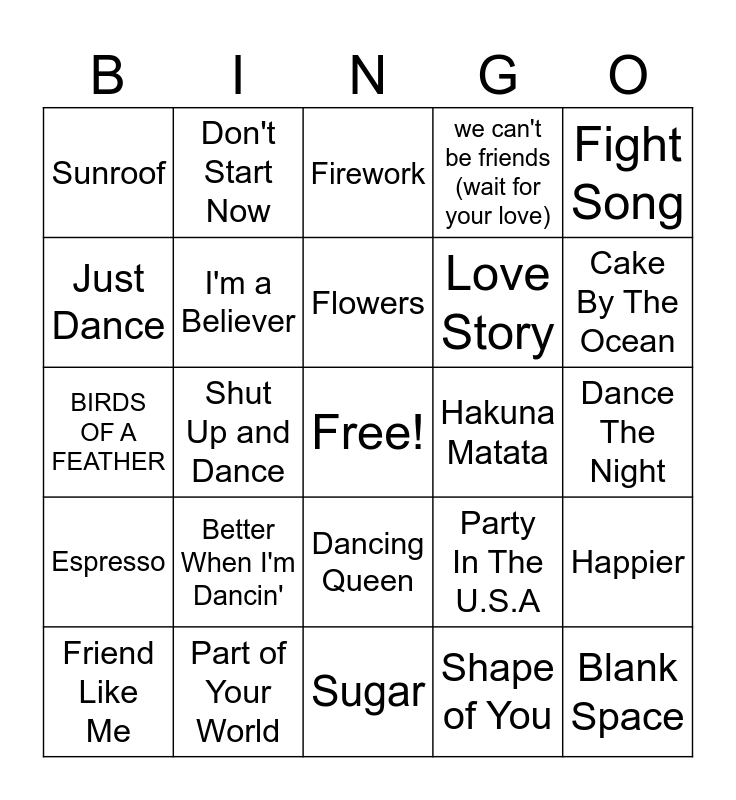 This bingo card has a free space and 24 words: Better When I'm Dancin', Part of Your World, Flowers, Friend Like Me, Fight Song, Sunroof, Just Dance, Don't Start Now, Hakuna Matata, Dancing Queen, Love Story, BIRDS OF A FEATHER, Party In The U.S.A, Happier, I'm a Believer, Shape of You, Dance The Night, Firework, Cake By The Ocean, Shut Up and Dance, Blank Space, Espresso, we can't be friends (wait for your love) and Sugar.