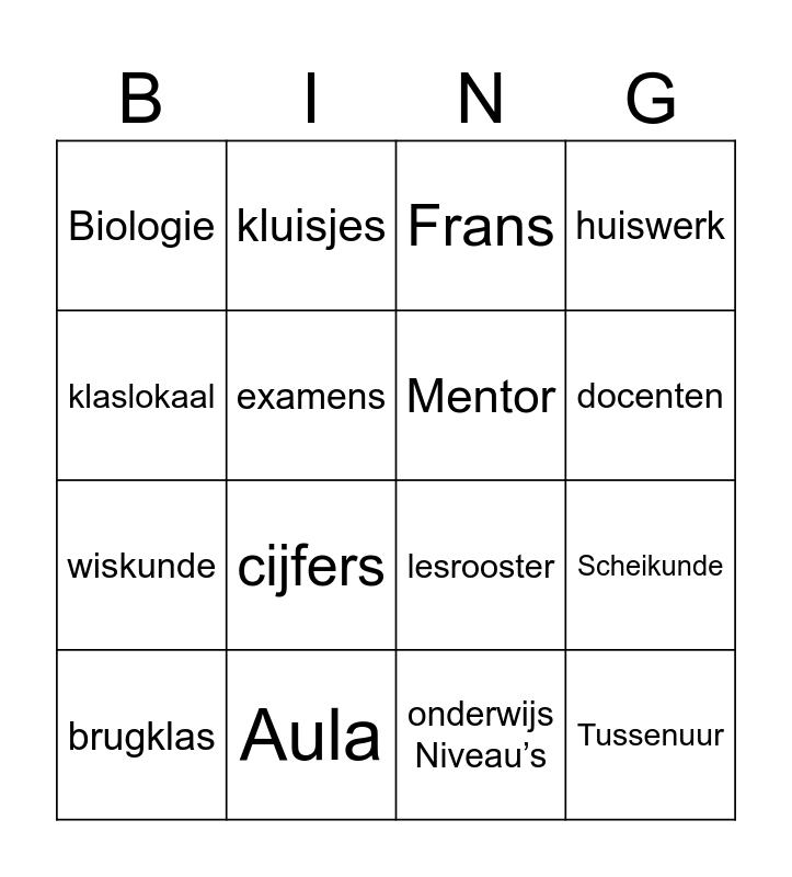 This bingo card has 16 words: Aula, Scheikunde, Frans, Biologie, wiskunde, kluisjes, lesrooster, onderwijs Niveau’s, klaslokaal, examens, brugklas, huiswerk, cijfers, docenten, Mentor and Tussenuur.