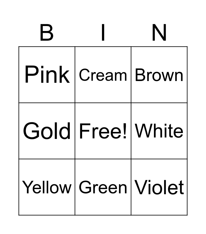 This bingo card has a free space and 17 words: Black, Purple, Brown, Pink, Red, Gold, Gray, Yellow, Green, White, Silver, Lime, Violet, Cream, Tan, Orange and Teal.