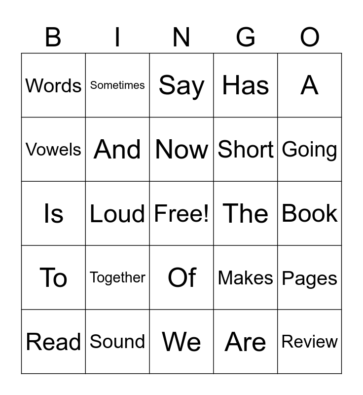 This bingo card has a free space and 29 words: Read, Out, Loud, Sounding, Words, Say, And, Together, The, Sound, Book, Review, We, Are, Going, Name, Of, To, A, Is, Makes, Was, Short, Vowels, Has, Sometimes, Pages, Now and Some.