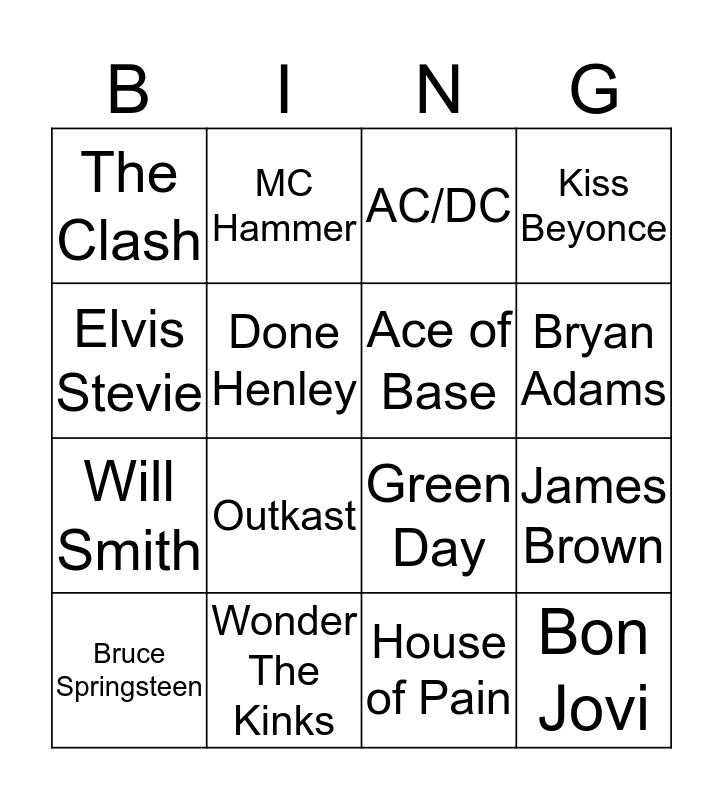 This bingo card has a free space and 20 words: James Brown, Michael Jackson, AC/DC, Billy Idol, Bruce Springsteen, Elvis Stevie, Wonder The Kinks, The Clash, Will Smith, MC Hammer, Outkast, Bon Jovi, Done Henley, Thin Lizzy, Ace of Base, Fleetwood Mac, Bryan Adams, Kiss Beyonce, House of Pain and The Knack.