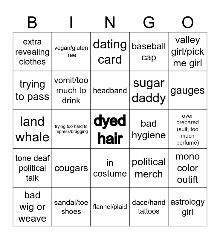 This bingo card has a free space and 39 words: rainbow vomit outfit, hitting on staff, using disability for sympathy, vomit/too much to drink, bad wig or weave, in costume, headband, special, valley girl/pick me girl, tone deaf political talk, trying too hard to impress/bragging, baseball cap, astrology girl, over prepared (suit, too much perfume), bad hygiene, cougars, liquid courage, extra revealing clothes, cheapskates (bad tip/free drinks), political merch, trying to pass, flannel/plaid, sugar daddy, gauges, nerd shirt (anime/marrvel), septum piercing, sunglasses inside, smells like weed, lisp, vegan/gluten free, fedora, neckbeard, dating card, sandal/toe shoes, dace/hand tattoos, wearing aniaml accessories, mono color outift, land whale and Karen (name or acting).