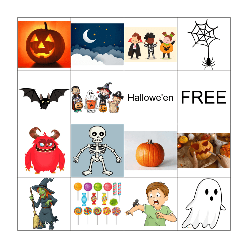 This bingo card has 14 images and 2 words: FREE and Hallowe'en.