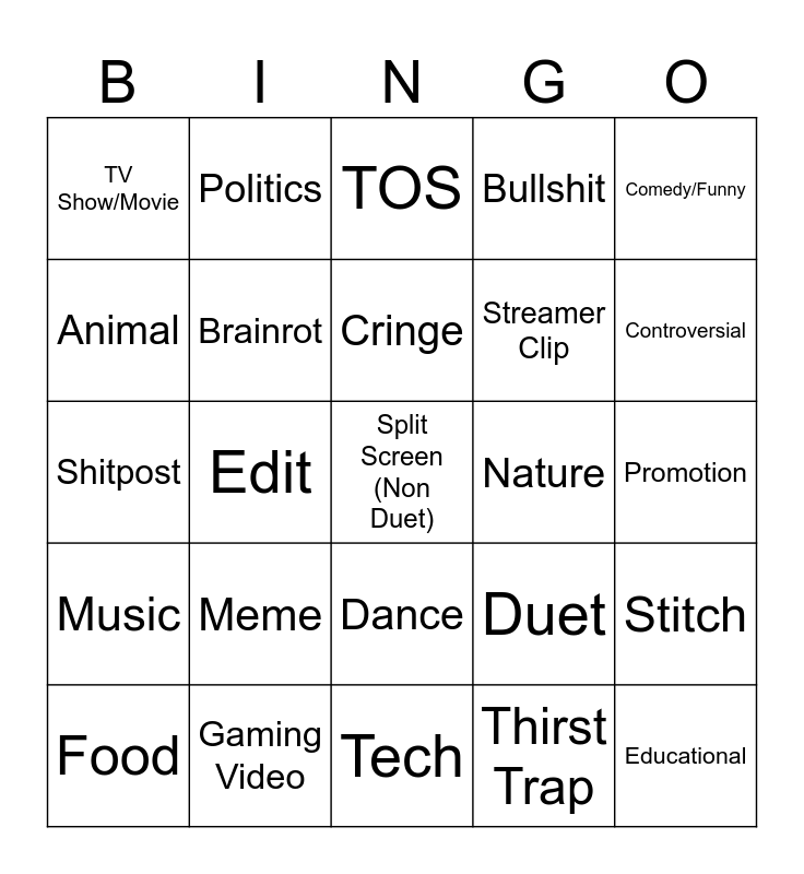 This bingo card has a free space and 24 words: Meme, Gaming Video, Cringe, Food, Comedy/Funny, TV Show/Movie, Animal, Politics, Nature, Dance, Streamer Clip, Shitpost, Duet, Stitch, Brainrot, Thirst Trap, Promotion, TOS, Controversial, Edit, Educational, Music, Bullshit and Tech.