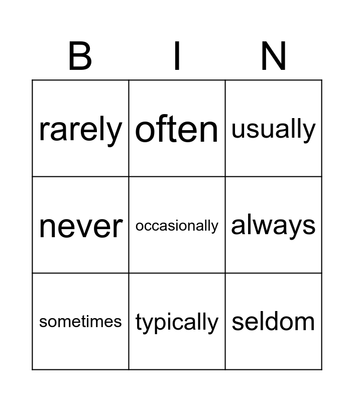 This bingo card has a free space and 8 words: always, usually, often, sometimes, rarely, seldom, never and typically.