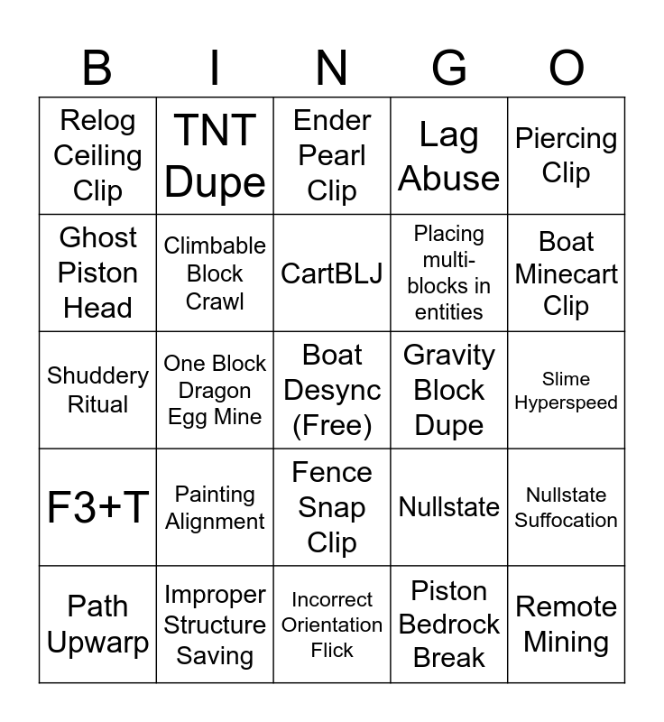 This bingo card has a free space and 24 words: Painting Alignment, Improper Structure Saving, CartBLJ, Path Upwarp, Piercing Clip, Relog Ceiling Clip, Ghost Piston Head, TNT Dupe, Gravity Block Dupe, Fence Snap Clip, Placing multi-blocks in entities, Shuddery Ritual, Nullstate, Nullstate Suffocation, Climbable Block Crawl, Piston Bedrock Break, Slime Hyperspeed, Ender Pearl Clip, Boat Minecart Clip, One Block Dragon Egg Mine, Remote Mining, F3+T, Lag Abuse and Incorrect Orientation Flick.