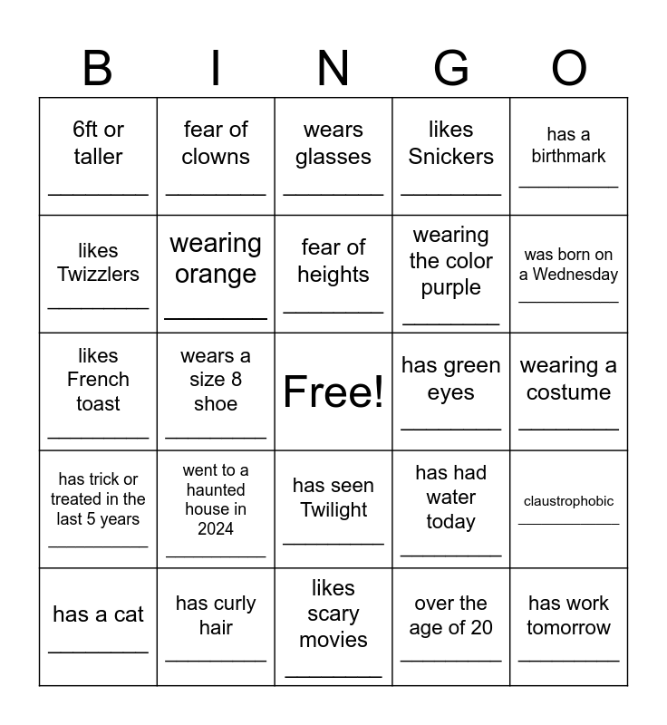 This bingo card has a free space and 29 words: has a cat ________, likes candy corn _________, wears a size 8 shoe _________, birthday in October _________, 6ft or taller ________, wears glasses ________, wearing orange _______, went to a haunted house in 2024 ___________, has green eyes ________, has curly hair _________, wearing a costume ________, has work tomorrow _________, likes scary movies ________, over the age of 20 _________, was born on a Wednesday ___________, likes rollercoasters ___________, has seen Twilight _________, has trick or treated in the last 5 years ___________, has a birthmark __________, likes French toast _________, has had water today _________, has read Romeo and Juliet __________, wearing the color purple ________, likes Twizzlers _________, likes Snickers ________, fear of clowns ________, claustrophobic _____________, fear of heights ________ and fear of spiders ________.