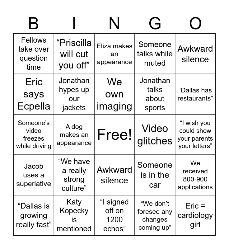 This bingo card has a free space and 45 words: “Call isn’t that bad”, Eric = cardiology girl, “I want to evenly distribute call”, “Dallas is growing really fast”, “The house staff are really tremendous”, “We don’t foresee any changes coming up”, Eliza makes an appearance, James/Oliver say hi, Awkward silence, Katy Kopecky is mentioned, Someone talks while muted, Video glitches, Awkward silence, “We have a really strong culture”, “They used to call it Parkland”, “I signed off on 1200 echos”, “We don’t believe in a research year”, Someone’s video freezes while driving, “We choose to limit the number of fellows”, “Dallas has restaurants”, “Priscilla will cut you off”, Ariane is outside, Applicant asks if we hang out, Fellows take over question time, The Lemieuxs are not related, “I wish you could show your parents your letters”, “We call it BUMC”, Someone forgets they’re unmuted, Someone is in the car, Jacob uses a superlative, Grayson makes an appearance, We received 800-900 applications, Jonathan or Jacob tells a dad joke, Jacob talks about 3D printing, Binx and/or Jasko make an appearance, A dog makes an appearance, Adam does triathlons, Someone gets put in the wrong interview room, Oxymoronic non-invasive interventionalist, We own imaging, Eric says Ecpella, Jonathan talks about sports, Alex is cultured, Jonathan hypes up our jackets and Dr. Sills almost got a PhD.