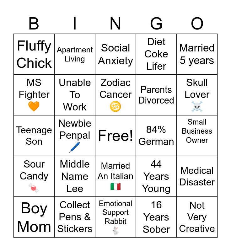 This bingo card has a free space and 25 words: Middle Name Lee, Emotional Support Rabbit ๐, Zodiac Cancer โ๏ธ, Boy Mom, Married 5 years, Fluffy Chick, MS Fighter ๐งก, Apartment Living, 84% German, Married An Italian ๐ฎ๐น, Parents Divorced, Teenage Son, 44 Years Young, Medical Disaster, Unable To Work, Orange Black Sparkle, Small Business Owner, Social Anxiety, Skull Lover โ ๏ธ, Newbie Penpal ๐, Not Very Creative, Collect Pens & Stickers, Sour Candy ๐ฌ, Diet Coke Lifer and 16 Years Sober.