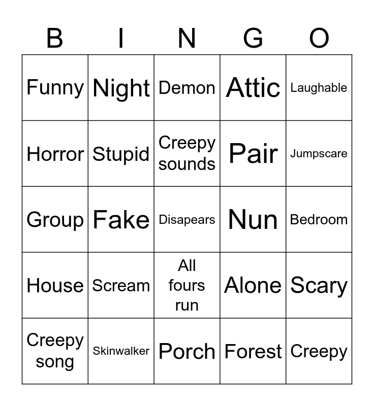 This bingo card has 25 words: Scream, Porch, Creepy sounds, Creepy song, Laughable, Funny, Horror, Night, Nun, All fours run, Pair, Group, Alone, Scary, Stupid, Creepy, Bedroom, Demon, Jumpscare, Fake, Disapears, Skinwalker, House, Attic and Forest.