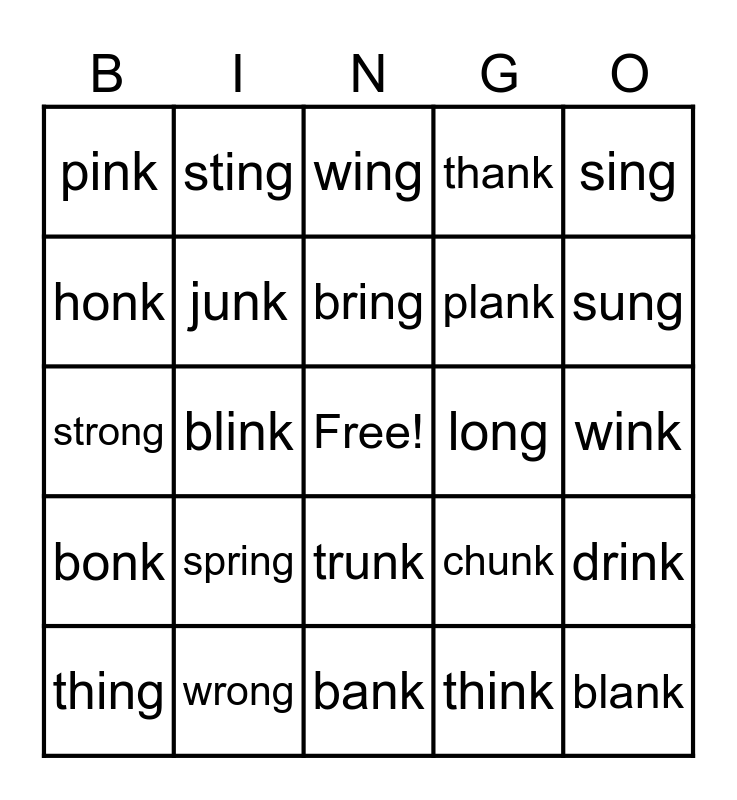 This bingo card has a free space and 33 words: swing, cling, blink, fang, bonk, junk, sing, thing, sting, ring, bring, wing, king, hung, long, sung, wrong, strong, spring, chunk, trunk, sunk, pink, wink, bank, blank, thank, plank, honk, drink, stink, think and sank.