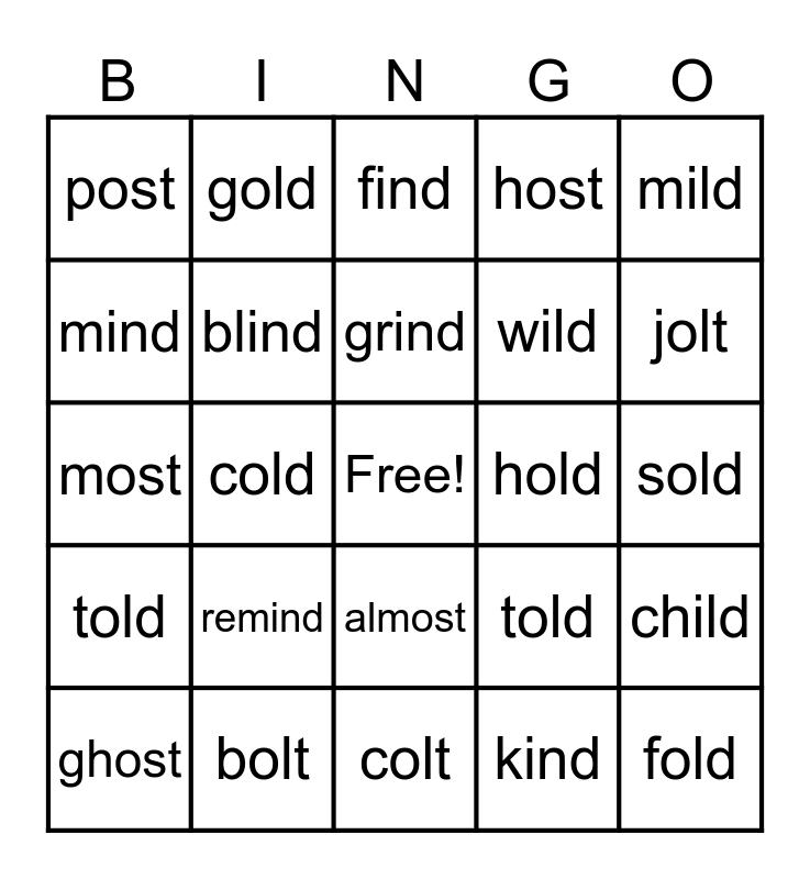 This bingo card has a free space and 28 words: child, mild, wild, kind, mind, find, gold, told, hold, ghost, most, host, bolt, colt, jolt, behind, remind, blind, grind, almost, post, host, fold, cold, sold, told, mild and bold.