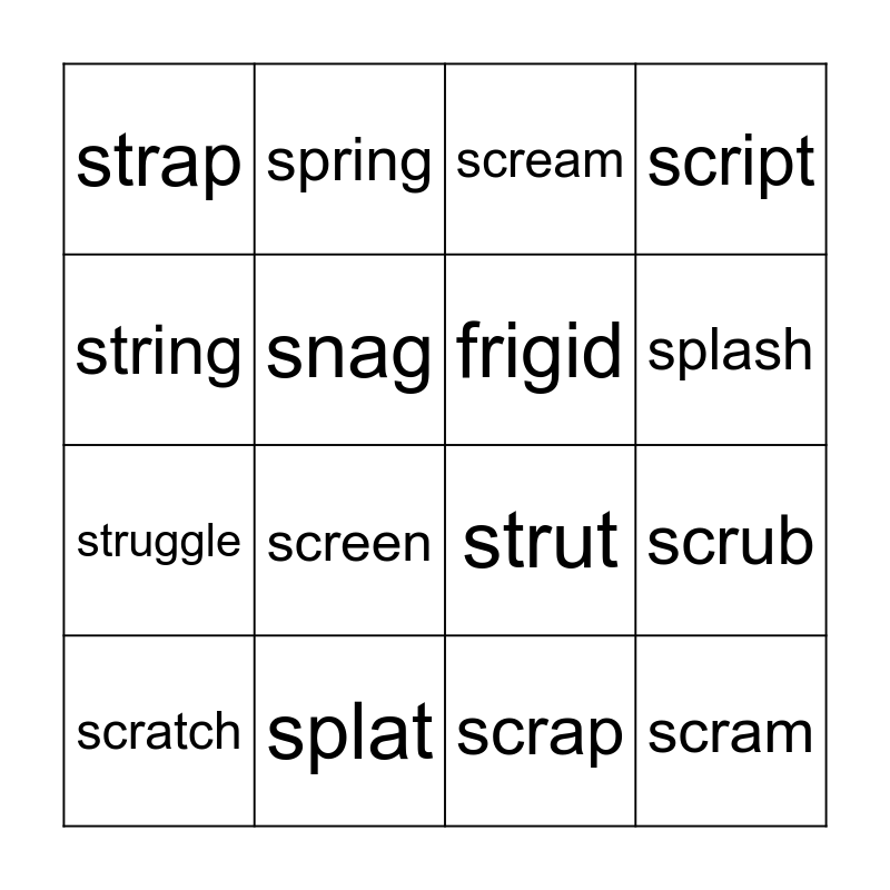 This bingo card has 24 words: sprint, spry, splash, sprout, string, strap, snag, spring, splat, strength, struggle, strut, throb, turtle, frigid, splinter, scrap, scream, screen, scrub, scratch, scram, script and scroll.