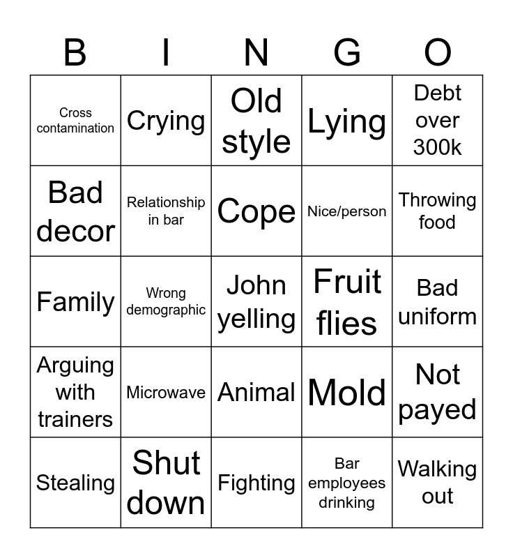This bingo card has a free space and 24 words: Microwave, Shut down, Cope, Stealing, Debt over 300k, Cross contamination, Bad decor, Crying, Fruit flies, Animal, Nice/person, Family, Mold, Not payed, Relationship in bar, Bar employees drinking, Bad uniform, Old style, Throwing food, Wrong demographic, Walking out, Arguing with trainers, Lying and Fighting.