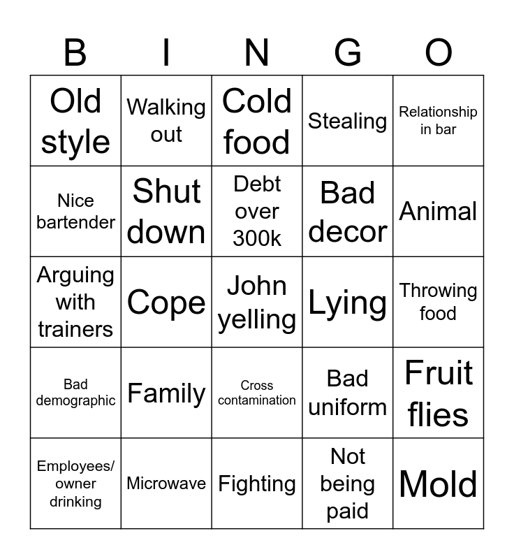 This bingo card has a free space and 24 words: Family, Microwave, Debt over 300k, Employees/ owner drinking, Relationship in bar, Old style, Nice bartender, Walking out, Lying, Cross contamination, Bad decor, Arguing with trainers, Bad uniform, Fruit flies, Shut down, Not being paid, Throwing food, Cold food, Animal, Cope, Mold, Bad demographic, Stealing and Fighting.