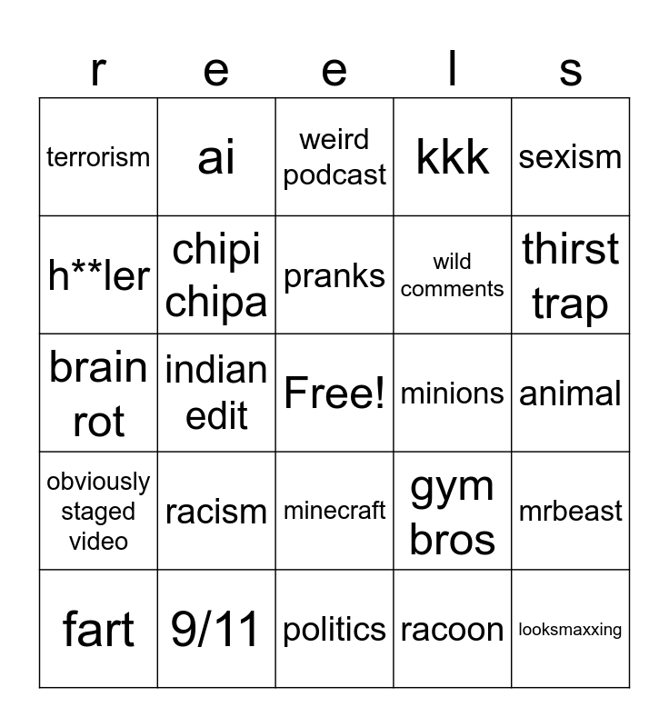 This bingo card has a free space and 24 words: racism, 9/11, pranks, fart, sexism, terrorism, h**ler, ai, minions, minecraft, wild comments, brain rot, gym bros, mrbeast, chipi chipa, racoon, animal, weird podcast, thirst trap, indian edit, looksmaxxing, obviously staged video, kkk and politics.
