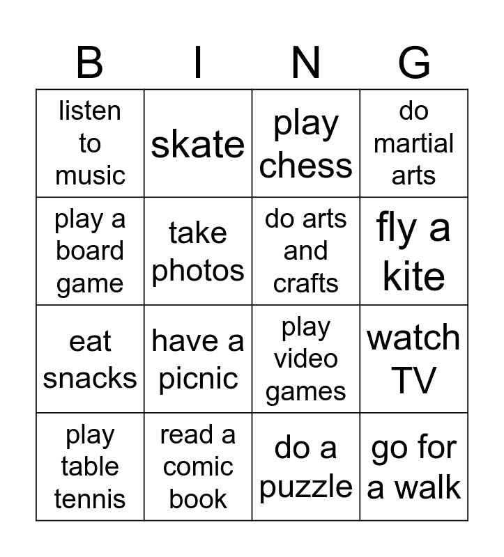 This bingo card has 16 words: read a comic book, watch TV, play chess, listen to music, eat snacks, skate, play video games, do a puzzle, play a board game, take photos, play table tennis, do martial arts, have a picnic, fly a kite, do arts and crafts and go for a walk.