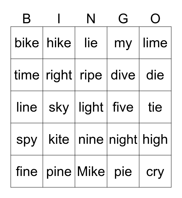 This bingo card has a free space and 24 words: kite, pine, ripe, fine, lime, bike, time, hike, five, nine, dive, line, night, high, right, pie, tie, lie, die, sky, cry, spy, my and Mike.