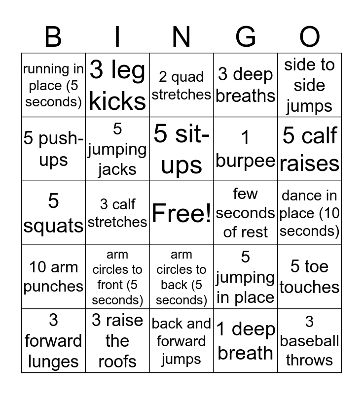 This bingo card has a free space and 24 words: arm circles to front (5 seconds), 3 raise the roofs, 5 sit-ups, 3 forward lunges, side to side jumps, running in place (5 seconds), 5 push-ups, 3 leg kicks, few seconds of rest, arm circles to back (5 seconds), 1 burpee, 5 squats, 5 jumping in place, 5 toe touches, 5 jumping jacks, 1 deep breath, dance in place (10 seconds), 2 quad stretches, 5 calf raises, 3 calf stretches, 3 baseball throws, 10 arm punches, 3 deep breaths and back and forward jumps.
