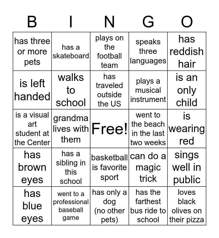 This bingo card has a free space and 24 words: has a sibling in this school, went to a professional baseball game, has traveled outside the US, has blue eyes, has reddish hair, has three or more pets, is left handed, has a skateboard, went to the beach in the last two weeks, basketball is favorite sport, plays a musical instrument, is a visual art student at the Center, can do a magic trick, sings well in public, walks to school, has the farthest bus ride to school, is wearing red, plays on the football team, is an only child, grandma lives with them, loves black olives on their pizza, has brown eyes, speaks three languages and has only a dog (no other pets).